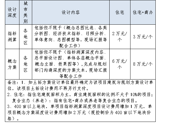 1.土拓方案設計費用為單價包干價,包括一切可能發生的費用,不同業態的土拓方案設計費如下表,參選人如中標,土拓方案設計費用按照下表執行。
