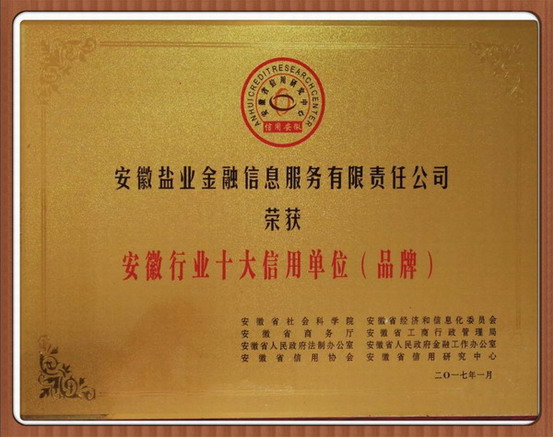 徽鹽金融被評為“安徽行業(yè)十大信用單位”
